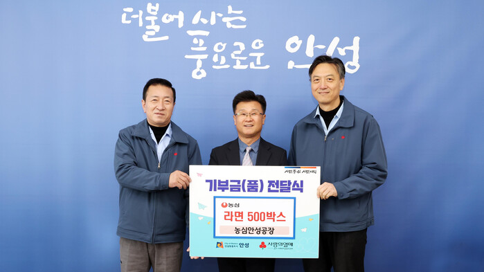 ㈜농심 안성공장(공장장 송호정)은 직원들의 성금으로 마련한 기금으로 자사 제품인 ‘안성탕면’ 500박스(약 700만 원 상당)를 지역 내 취약계층에게 전달했다.