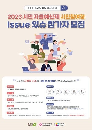청주시와 청주시문화산업진흥재단 문화도시센터(대표이사 변광섭, 이하 문화도시센터)가 오는 7월 7일 오후 6시까지 시민참여형 프로젝트 ‘2023 시민 자율예산제 시민참여형 Issue있슈’에 함께할 시민을 모집한다고 밝혔다.