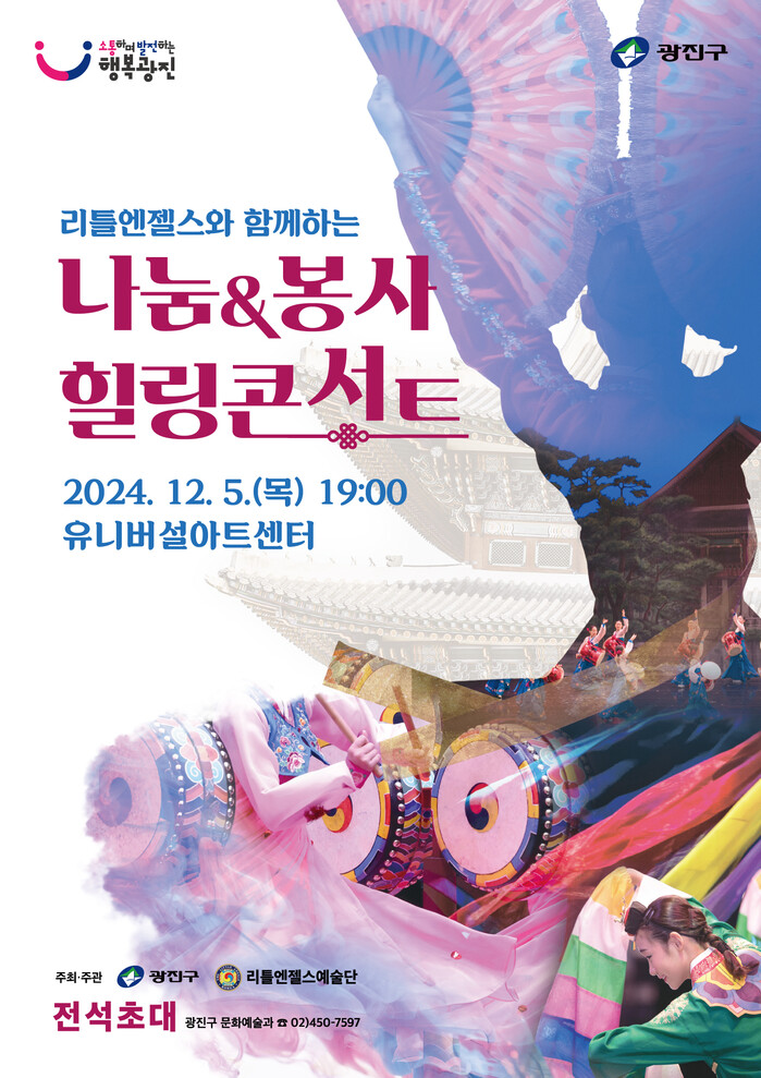 [시민일보 = 여영준 기자] 광진구(구청장 김경호)가 오는 12월5일 유니버설아트센트(천호대로664)에서 ‘나눔과 봉사, 힐링 콘서트’를 개최한다.