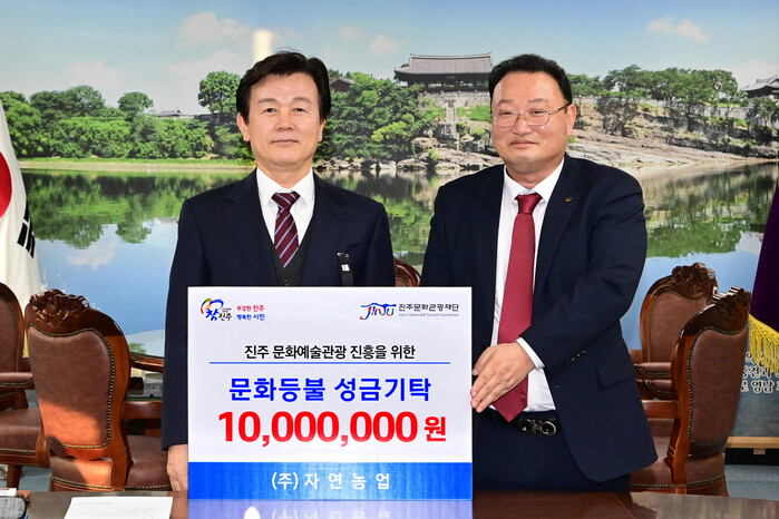㈜자연농업(대표 강혁중)이 30일 시청 5층 기업인의 방에서 진주 지역 문화예술 진흥을 위한 1천만 원의 기부금을 진주문화관광재단에 전달했다.