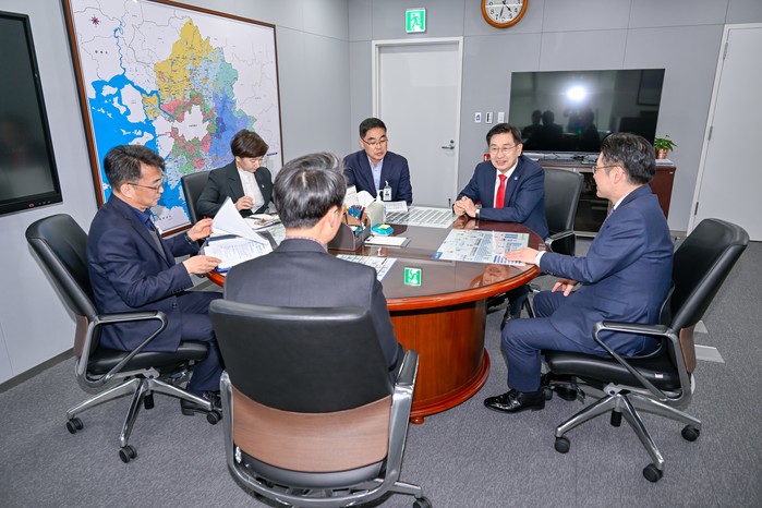 전진선 경기 양평군수는 지난 7일 경기도를 방문해 오병권 행정1부지사를 만나 경기 동부권 공공의료원 양평군 설치 등 지역 현안사항에 대한 적극적인 관심과 지원을 요청했다. 사진은 이날 전 군수(오른쪽 두 번째)가 지역 현안들을 설명하고 있는 모습. (사진=양평군청 제공)
