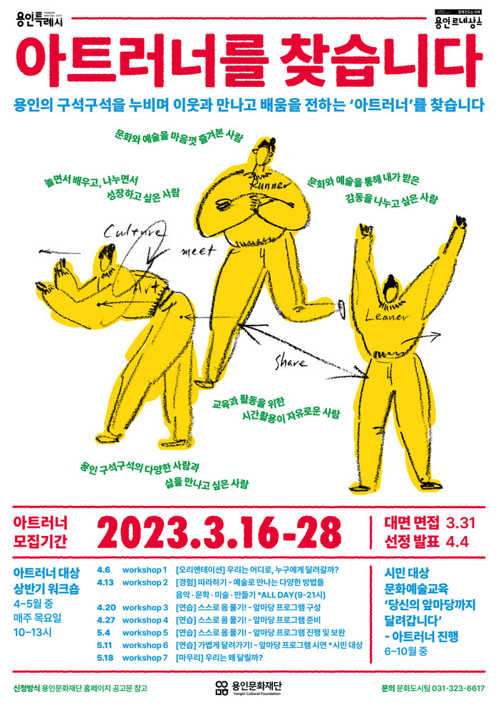 오는 4월부터 5월까지 아트러너는 워크숍을 통해 매개자의 자세 및 예술교육 프로그램 운영 방법을 배우고, 이후 6월부터 10월까지 시민을 대상으로 찾아가는 예술교육인 ‘당신의 앞마당까지 달려갑니다’를 직접 운영하며 용인시 구석구석을 누비며 다양한 이웃을 만나 문화예술교육을 전달할 예정이다.