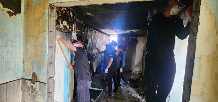 | ▲ 사진설명: 밀양시 건우회 회원들이 하남읍 아파트 화재 피해 가구에서 청소 봉사활동을 펼치고 있다. |