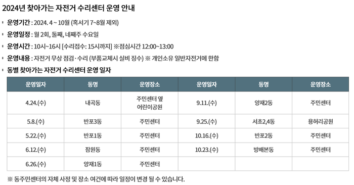 이와 함께 서초구는 양재천·사당역·방배역에 자전거를 점검·수리해주는 ‘자전거 수리센터’를 운영하고 있다. 특히 양재천과 사당역 수리센터에서는 세제를 사용하·지 않고 고압·고온의 스팀세척기를 사용해 자전거를 청소해주는 ‘서초 자전거 세척 서비스’도 제공한다. 자전거 수리를 원하는 주민은 서초구청 홈페이지에서 자전거 수리센터 운영 일정을 확인하고 가장 가까운 주민센터 혹은 양재천·사당역·방배역 수리센터를 방문하면 된다.
