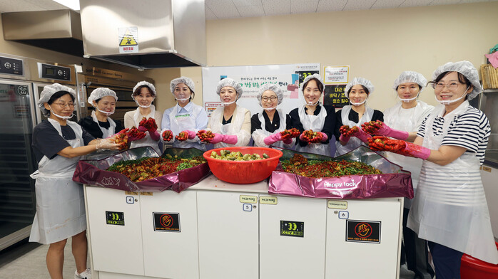 경기 과천종합사회복지관은 11일 복지관 요리배움실에서 취약계층의 건강한 여름나기를 돕기 위한 ‘사랑의 김치 나눔 행사’를 개최했다. 과천푸르지오써밋아파트 봉사단체인 ‘써밋어벤저스’ 회원 6명을 포함한 자원봉사자 10명이 참여해 정성껏 담근 김치를 수급자, 홀몸노인 등 복지관 사례관리 대상자 90가구에 직접 전달했다. 사진은 행사에 참석한 신계용 시장(왼쪽 다섯 번째)이 참석자들과 기념촬영을 하고 있는 모습. (사진=과천시청 제공)