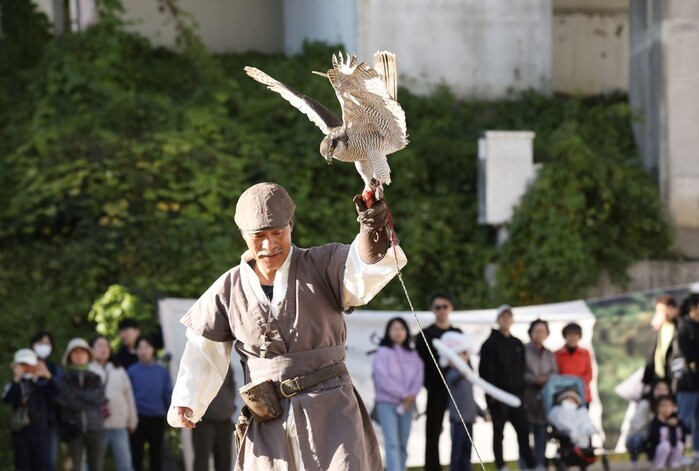 | ▲ 2023년 응봉 매사냥 축제에서 무형문화재 박용순 응사가 매사냥을 시연하는 모습. (사진=성동구청 제공) |