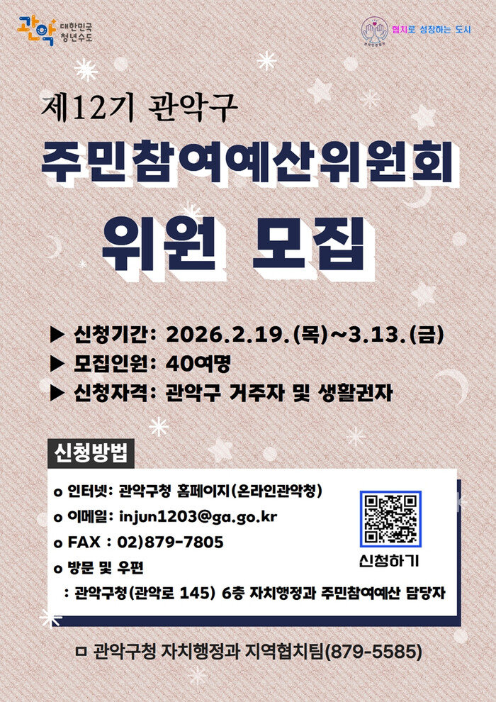 [시민일보 = 문민호 기자] 관악구(구청장 박준희)는 주민참여예산제를 새롭게 이끌어갈 ‘제12기 관악구 주민참여예산위원회’ 위원을 오는 3월13일까지 모집한다.