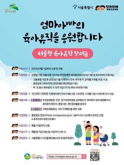 지원 대상은 ▲신청기준 서울시 1년 이상 거주 ▲중위소득 150% 이하 ▲2023년 1월부터 육아휴직을 시작해 연속 6개월 이상 지속 ▲고용보험 가입 후 육아휴직급여를 받는 부모 등이다.