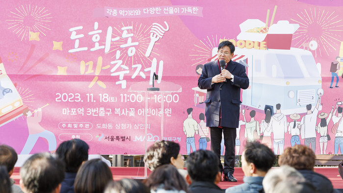 | ▲ 2023년 11월 마포역 인근서 개최된 도화동 맛축제를 찾은 박강수 구청장이 인사말을 하고 있는 모습. (사진=마포구청 제공) |