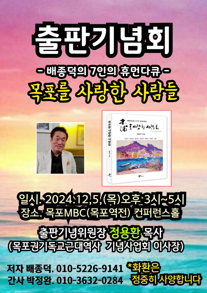 배종덕 작가의 신간 ‘목포를 사랑한 사람들’ 출판기념회가 12월 5일(목) 오후 3시부터 목포 MBC 컨퍼런스홀에서 개최된다.