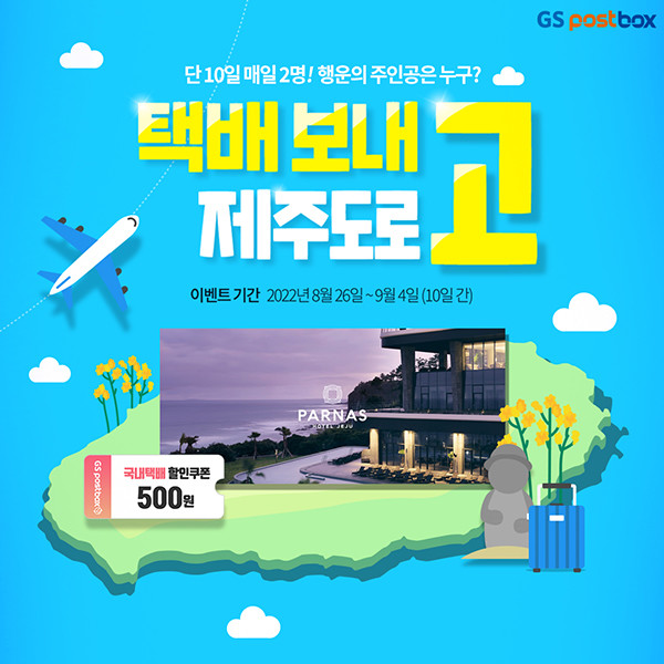 [시민일보 = 이승준 기자] GS포스트박스가 지난 25일부터 오는 9월4일까지 10일간 국내택배를 이용한 고객에게 경품을 증정하는 ‘택배 보내고 제주도로 고!’ 프로모션을 매일 진행한다.