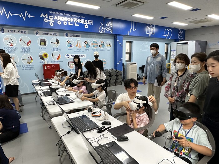 | ▲ 성동생명안전배움터에서 초등생들이 가상현실(VR) 재난안전교육 체험을 하고 있다. (사진=성동구청 제공) |