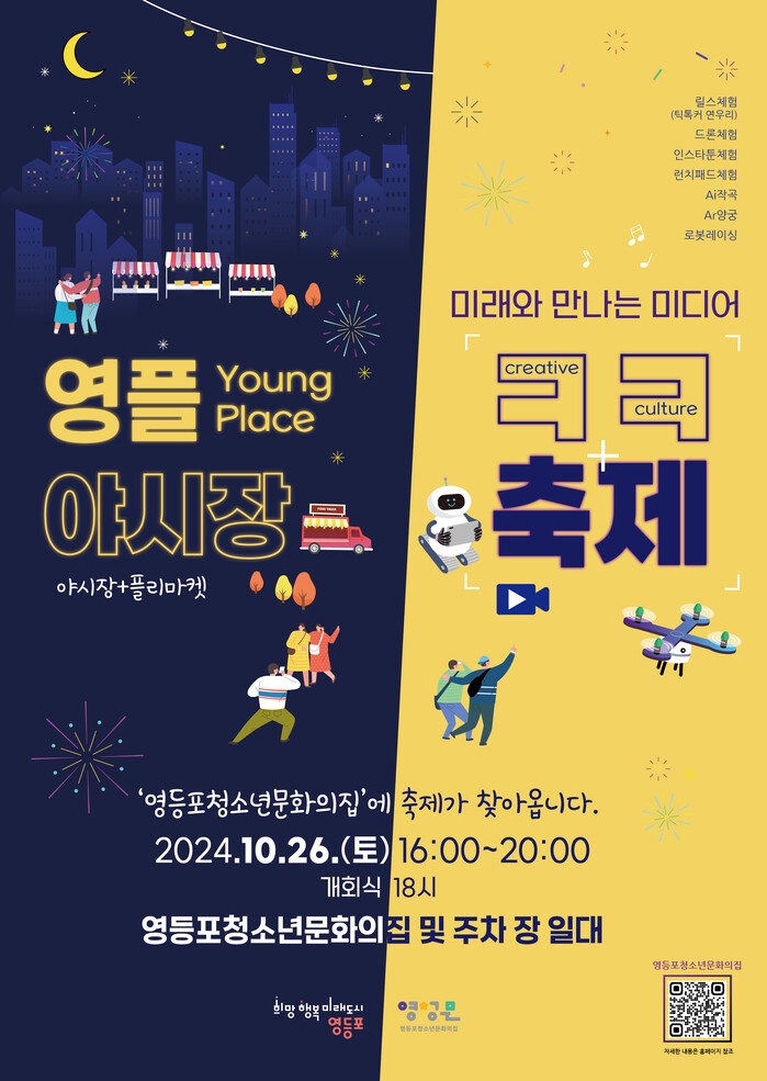 같은 날 오전 10시부터 저녁 8시까지는 영등포 청소년 문화의집에서 ‘미디어 축제 및 영플(Young-Place) 야시장’이 열린다. 이번 행사는 지역 내 청소년과 주민들이 함께 건강한 여가문화를 즐기며 지역 사회의 새로운 문화를 만들어갈 수 있는 장을 제공하기 위해 기획됐다.