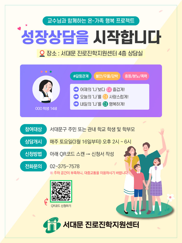[시민일보 = 이대우 기자] 서울 서대문구(구청장 이성헌)는 청소년이 있는 가족의 고민과 걱정, 스트레스 요인을 진단하고 이를 극복하는 데 도움을 주기 위해 맞춤형 심리상담 프로그램인 ‘성장상담’을 진행한다고 밝혔다.