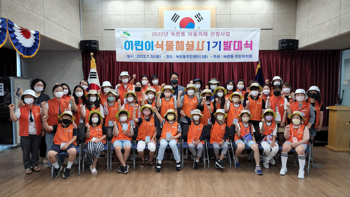 어린이 식물해설사는 어린이들에게 자연과 식물의 소중함을 알게 하고, 전문가로부터 식물에 대한 지식을 전수받는 식물해설사 교육프로그램으로 녹번동 거주 초·중고생 및 주민이 참여할 수 있다. 사진은 발대식에서 참가자들이 기념촬영을 하고 있는 모습.(사진제공=은평구청)