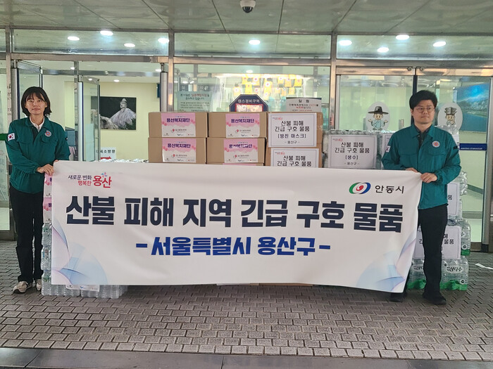 [시민일보 = 문민호 기자] 용산구(구청장 박희영)는 최근 대형 산불로 큰 어려움을 겪고 있는 경북 안동시에 방진마스크, 빵, 생수 등 구호물품을 지원했다고 28일 밝혔다.