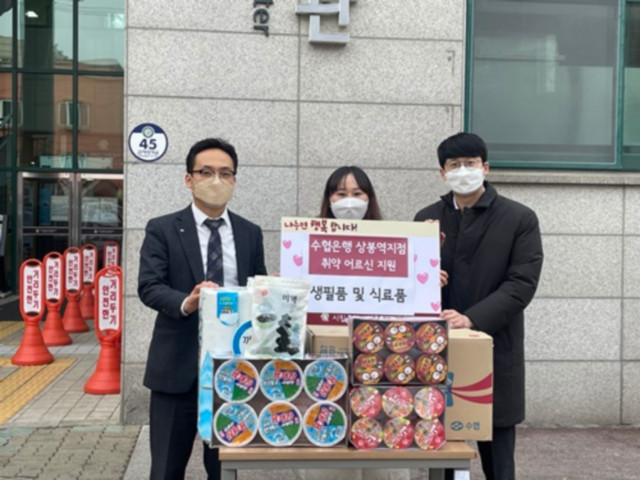 시립중랑노인종합복지관은 수협은행 서울 상봉역지점으로부터 최근 중랑구 취약 노인을 위한 미역·라면 등 생필품 및 식료품을 전달받았다. 전달 물품은 지역내 취약 노인 10가정에 전달될 예정이다. 사진은 전달식에서 관계자들이 기념촬영을 하는 모습. (사진제공=중랑구청)