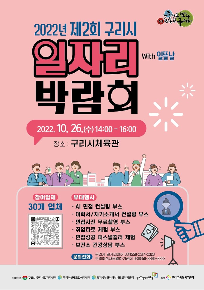또한 구리시 지역내 및 인근지역 30개 구인업체가 참여하고, 청년창업지원센터, 노인일자리유관기관, 노동자지원센터 등 시 산하기관들도 홍보부스를 운영한다.