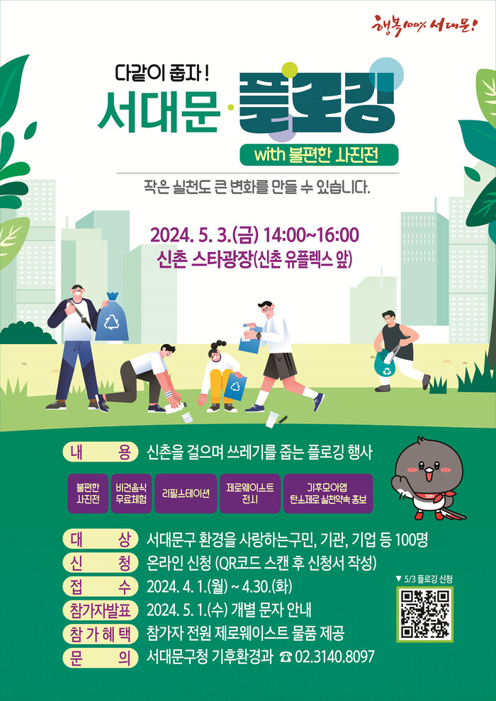 ‘다 같이 줍자! 서대문 플로깅’ 참여 희망자는 해당 포스터의 QR코드를 스캔해 신청할 수 있으며 자세한 내용은 서대문구청 기후환경과로 문의하면 된다.