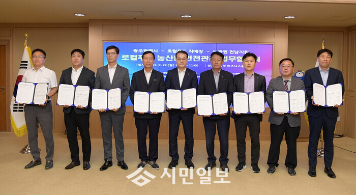 | ▲ 김영문 광주광역시 문화경제부시장이 22일 오전 시청 비즈니스룸에서 국립농산물품질관리원 전남지원, 로컬푸드 직매장 대표 등과 로컬푸드 농산물 안전관리 업무협약을 체결한 후 기념촬영을 하고 있다. /광주광역시 제공 |