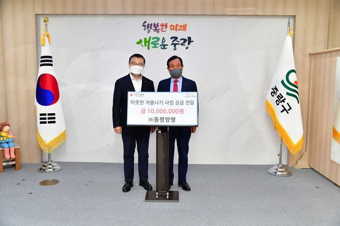 서울 중랑구는 최근 (주)동명양행으로부터 2022 희망온돌 따뜻한 겨울나기 성금 1000만원을 전달받았다. 전달된 성금은 서울사회복지공동모금회를 통해 지역내 어려운 이웃을 위해 사용될 예정이다. 사진은 전달식에서 류경기 구청장(왼쪽)과 안동식 대표가 기념촬영을 하는 모습. (사진제공=중랑구청)