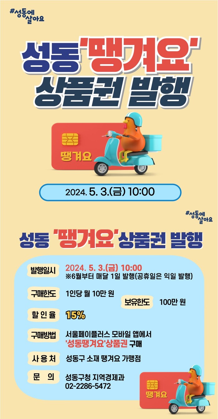 [시민일보 = 변은선 기자] 서울 성동구(구청장 정원오)가 관내 소상공인의 높은 배달중개수수료 부담을 완화하고 구민들은 할인된 금액으로 성동형 공공배달앱을 이용할 수 있도록 ‘성동땡겨요 상품권’을 첫 발행한다.