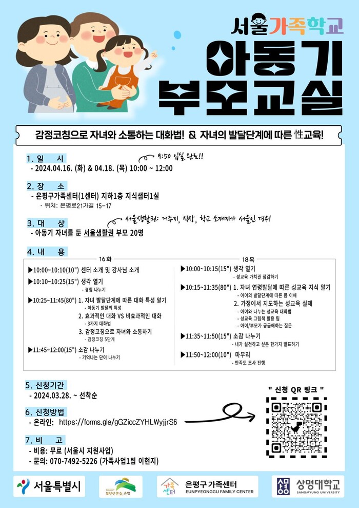 ‘아동기 부모교실’은 오는 16일과 18일, 오전 10시부터 낮 12시까지 은평구 가족센터에서 진행된다. 신청은 포스터를 참고해 온라인 링크로 접속해 하면된다.