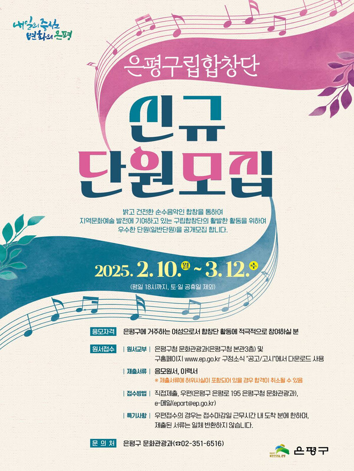 [시민일보 = 이대우 기자] 은평구(구청장 김미경)가 구의 대표 문화사절단인 은평구립합창단과 함께 할 신규 단원을 오는 10일부터 모집한다.
