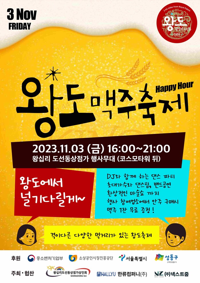 [시민일보 = 홍덕표 기자] 서울 성동구(구청장 정원오) 왕십리도선동상점가에서 오는 11월 3일 오후 4~9시 '왕도맥주축제'가 열린다.