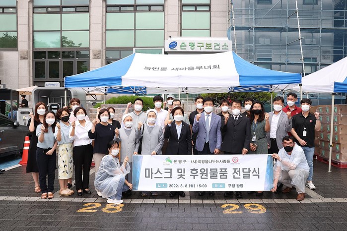 서울 은평구는 최근 (사)희망을나누는사람들로부터 마스크, 핸드워시 등 생필품과 화장품을 포함한 총 3억원 상당 물품을 후원받았다. 구는 전달받은 후원품을 사회적 취약계층에 고루 배분될 수 있도록 사회복지시설 30여곳과 동주민센터 16곳에 배부했다. 사진은 전달식에는 김미경 구청장(앞줄 가운데)이 관계자들과 기념촬영을 하는 모습.(사진제공=은평구청)