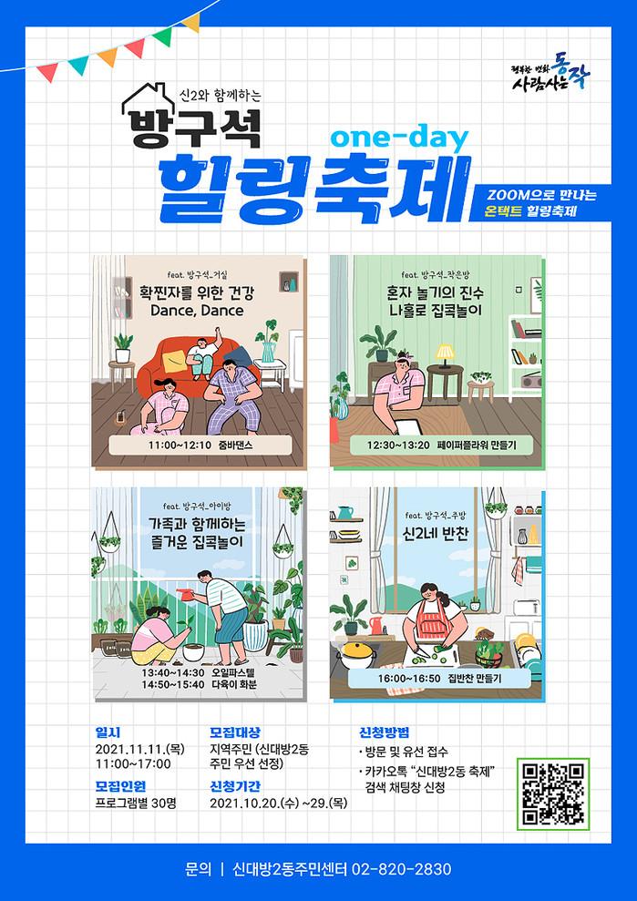 [시민일보 = 여영준 기자] 서울 동작구(구청장 이창우) 신대방2동 주민센터는 오는 11일 온가족이 집에서 즐길 수 있는 온택트 ‘one day 방구석 힐링축제’를 개최한다고 9일 밝혔다.