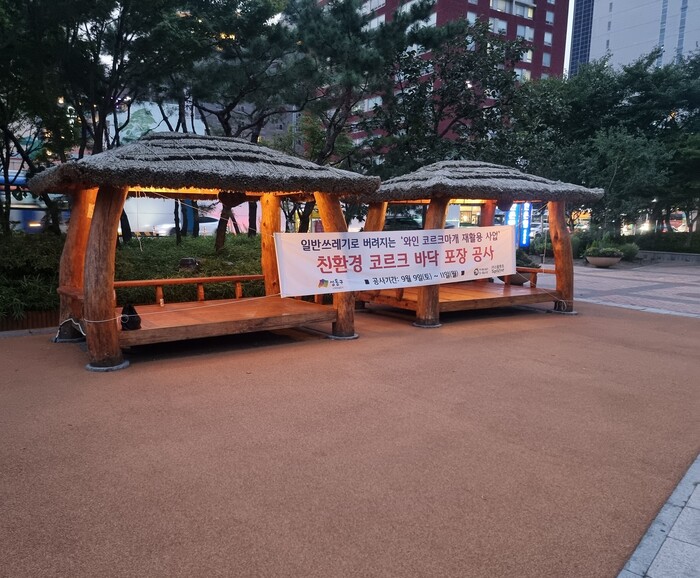 [시민일보 = 홍덕표 기자] 서울 성동구(구청장 정원오)가 코르크 마개를 재활용한 친환경 바닥재를 시범설치했다.