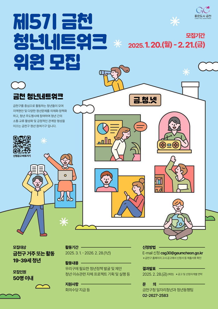 [시민일보 = 여영준 기자] 금천구(구청장 유성훈)는 오는 21일까지 ‘2025년 제5기 금천 청년 네트워크’에 참여할 청년을 모집한다고 밝혔다.