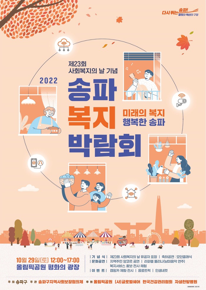 [시민일보 = 이대우 기자] 서울 송파구(구청장 서강석)가 오는 29일 낮 12시 올림픽공원 평화의 광장에서 ‘2022 송파복지박람회’를 개최한다.