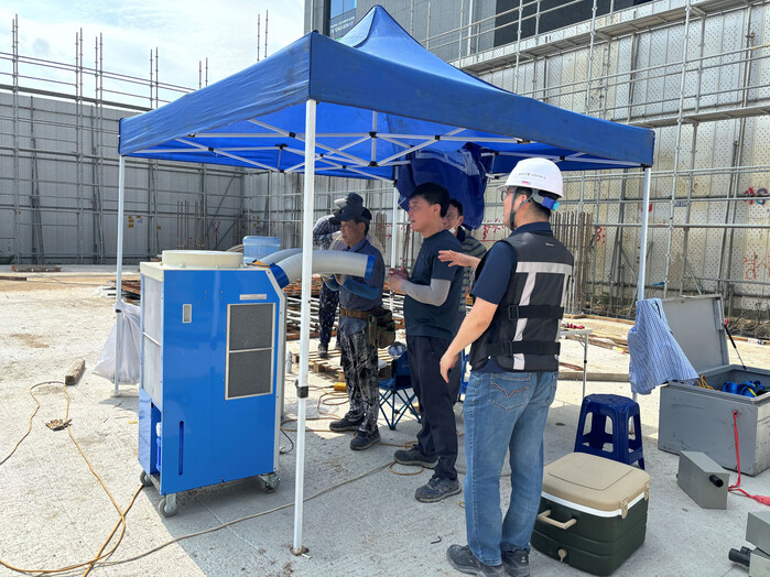| ▲ 건축안전관리과-공사장 현장 근로자들이 그늘막에서 이동식 에어컨으로 더위를 식히고 있다. |