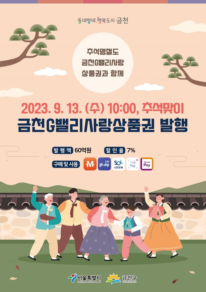 [시민일보 = 여영준 기자] 금천구(구청장 유성훈)는 추석 명절을 맞아 오는 13일 오전 10시 ‘금천G밸리사랑상품권’ 60억을 발행한다고 7일 밝혔다.
