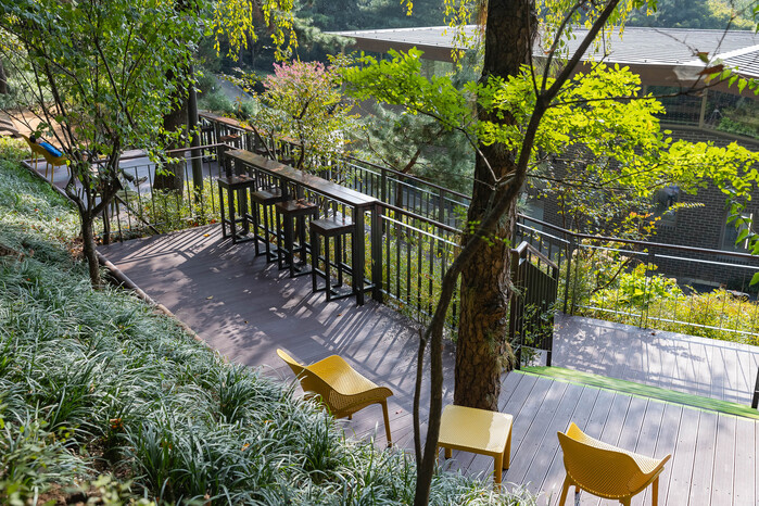 편의시설은 의자와 독서 테이블 등 다양하게 갖췄다. 자연과 마주한 위치에 스탠드형 책상을 놓아 개방감을 살린 점이 특징이다. 곳곳에는 따뜻한 색감의 푹신한 빈백을 배치해 편히 쉬어갈 수 있도록 했다. 아차산을 찾은 방문객 누구나 무료로 이용할 수 있다.