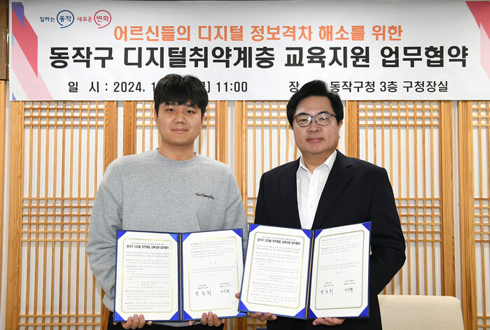 | ▲ 지난 11월, 박일하 동작구청장(우)이 이수현 넥스트커넥트 대표와 '동작구 디지털취약계층 교육지원 업무협약'을 체결한 후 기념 촬영하고 있다.(사진=동작구청 제공) |