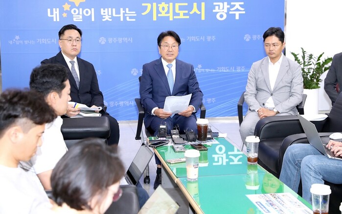 | ▲ 강기정 광주광역시장이 28일 오전 시청 5층 기자실에서 출입기자들과 차담회를 갖고 시정 주요현안 등에 대해 설명하고 있다./광주광역시 제공 |