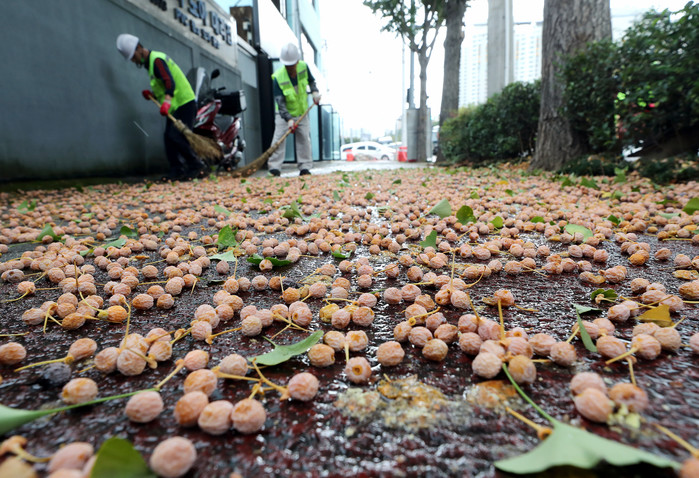 4일 오후 부산시 부산진구 양정동 인근 도로에서 구청 관계자들이 은행나무 열매 수거 작업을 하고 있다.