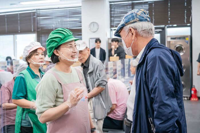 | ▲ 시립강동노인종합복지관에서 배식봉사를 하며 노인들과 소통을 하고 있는 이 구청장. (사진=강동구청 제공) |