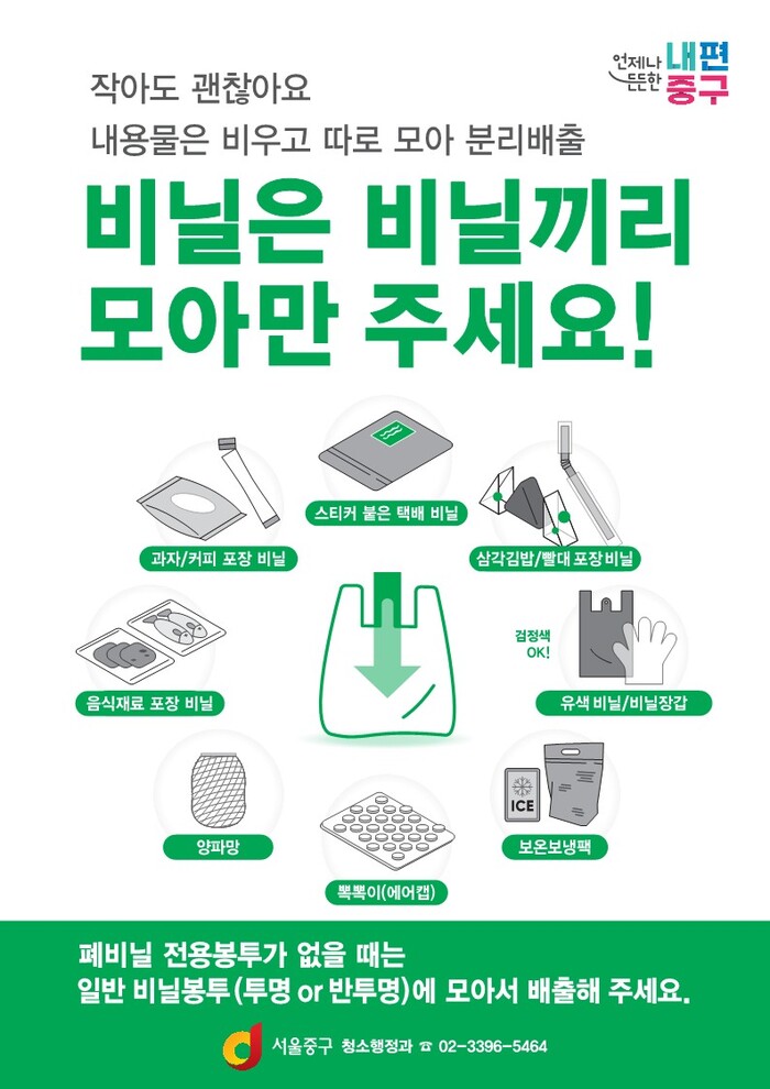 [시민일보 = 여영준 기자] 서울 중구는 생활폐기물을 감축하고 자원화하기 위해 종량제 봉투에 버려지는 폐비닐의 분리배출을 강화한다고 25일 밝혔다.
