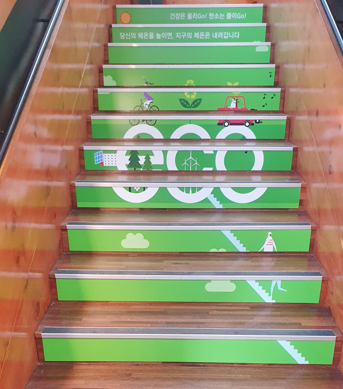 계단 구간에 ▲당신의 체온을 높이면, 지구의 체온은 내려갑니다 ▲계단을 딛고 있는 우리의 건강한 걸음이 누군가에겐 희망이 됩니다 ▲일상 속 작은 실천들이 모여 지구를 구합니다는 계단띠 부착으로 탄소감축 메시지를 전한다.