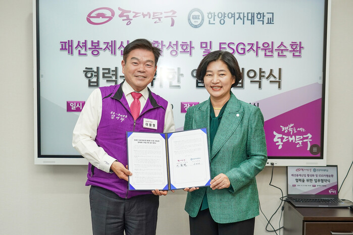 [시민일보 = 이대우 기자] 동대문구(구청장 이필형)가 패션봉제산업 활성화 및 ESG 자원순환 협력체계 구축을 위해 한양여자대학교와 협약을 체결했다.