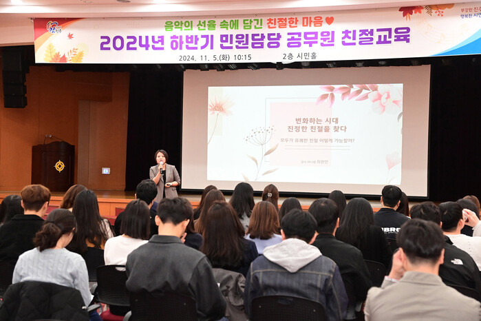 진주시는 5일 행정의 최일선에서 근무하고 있는 민원 담당 공무원 160여 명을 대상으로 시청 2층 시민홀에서 2024년 하반기 친절교육을 실시했다.