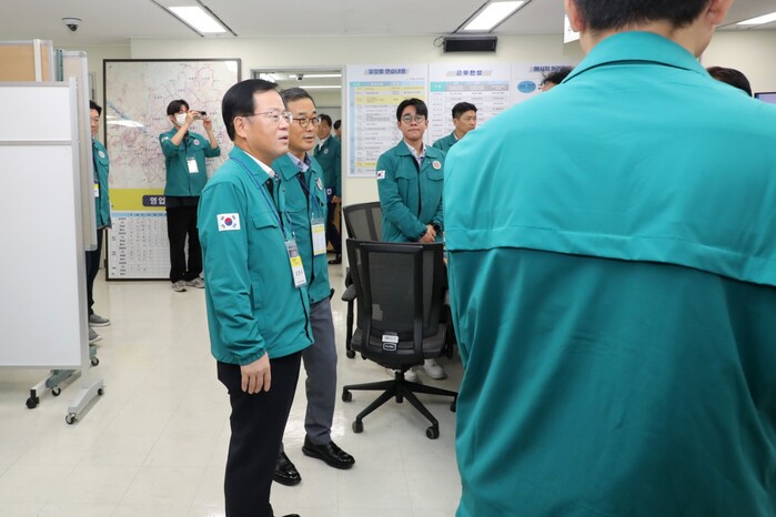 | ▲ 지난 19일 우리은행 조병규 은행장이 우리은행 본점 비상 대비 상황실을 찾아 2024 을지연습에 참여한 직원들을 격려하고 있다. (사진=우리은행 제공) |