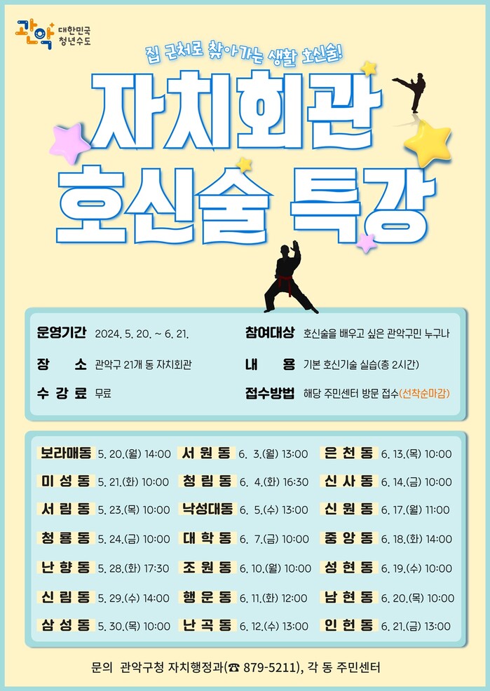 [시민일보 = 여영준 기자] 관악구(구청장 박준희)는 올해도 구민이 집 근처에서 쉽게 호신술 교육을 받을 수 있도록 오는 20일~6월21일 21개 동 자치회관에서 찾아가는 호신술 특강을 운영한다고 밝혔다.