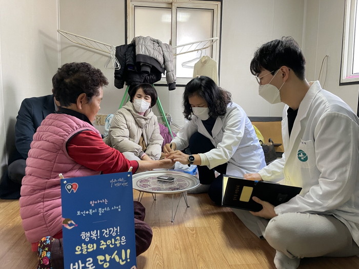충남 아산시 도고면 행복키움추진단과 도고보건지소가 29일 저소득 홀몸노인을 대상으로 맞춤형 한방의료 건강상담 및 생일상을 준비해 생일 잔치를 진행했다. 사진은 이날 혈압·당뇨체크 등 건강상담을 하고 있는 모습. (사진제공=아산시청)