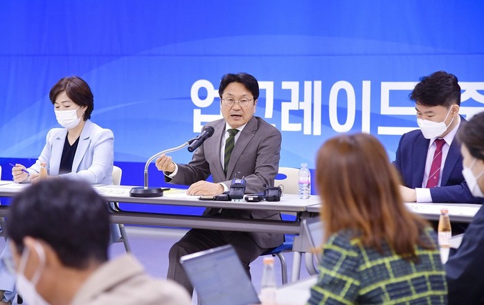 [광주=정찬남 기자] 강기정 광주광역시장 당선인이 15일 광주도시공사에 마련된 새로운 광주시대 준비위원회 대회의실에서 미디어데이를 갖고 민선 8기 시정 운영 방향 등을 밝히고 있다.