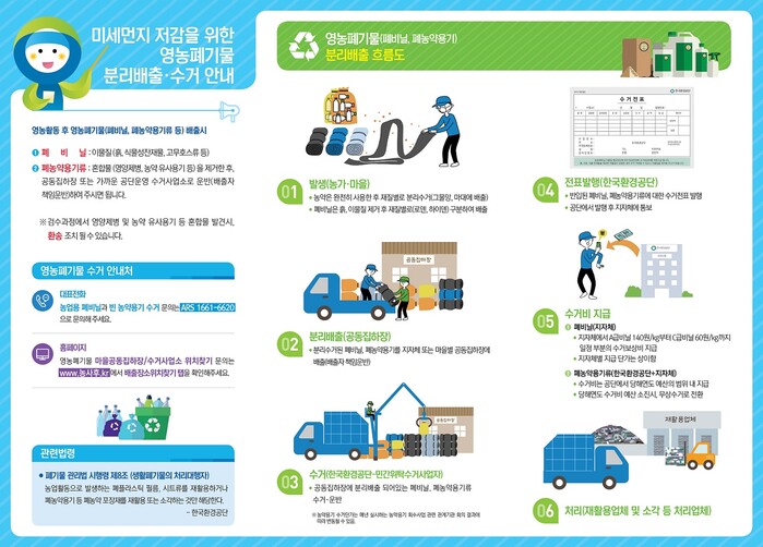 폐비늘은 흙, 돌 등 이물질을 제거하고 재질 및 색상별로 분류해 배출하고, 폐농약 용기는 내용물을 완전히 사용한 후 공동집하장 또는 마을단위 집하소 등 지정된 장소에 배출해 마을 대표자 및 공동집하장 관리자측에서 민간위탁수거사업자인 (주)한솔환경자원에서 수거를 요청하면 일괄 수거한다.